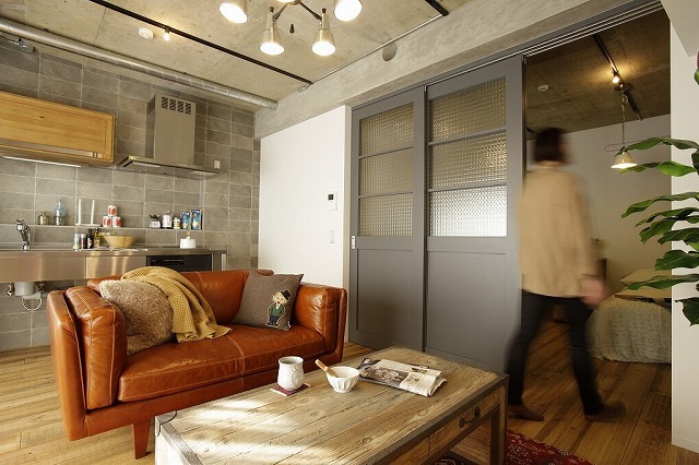 年を重ねた味わいのある建物のロフトで自由に暮らしたい。コンクリート剥き出しの天井や古材のようなざっくりとした床材、空間のアクセントに加わるタイルやステンレスなど重厚感がありつつもラフなデザインは、古いものに息を吹き込み再生させるリノベーションならでは。スラブを露出した天井にすることで、天井高が約2,600mmに。フラットな土間スペースから続くエイジング加工をかけた古材調のフローリング(無垢材)が部屋全体の雰囲気をまとめる。アンティークガラスを上部に使用した扉。ゆらゆらと光を通しながら、視線をシャットアウト。ドアとするか、壁と考えるか。可変性を楽しむ仕掛け。寝室の壁から壁にハンガーパイプを設置。服をかけるだけでなく、フックを使って帽子やバックなどの小物や植物、ライトなども引掛けて。