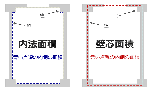 一方、壁の内側の寸法で測られた面積を内法面積といいます。マンションなどの区分所有建物では内法面積で登記されるため、パンフレットなどの専有面積より、実際の登記面積はやや狭くなるので注意が必要です。